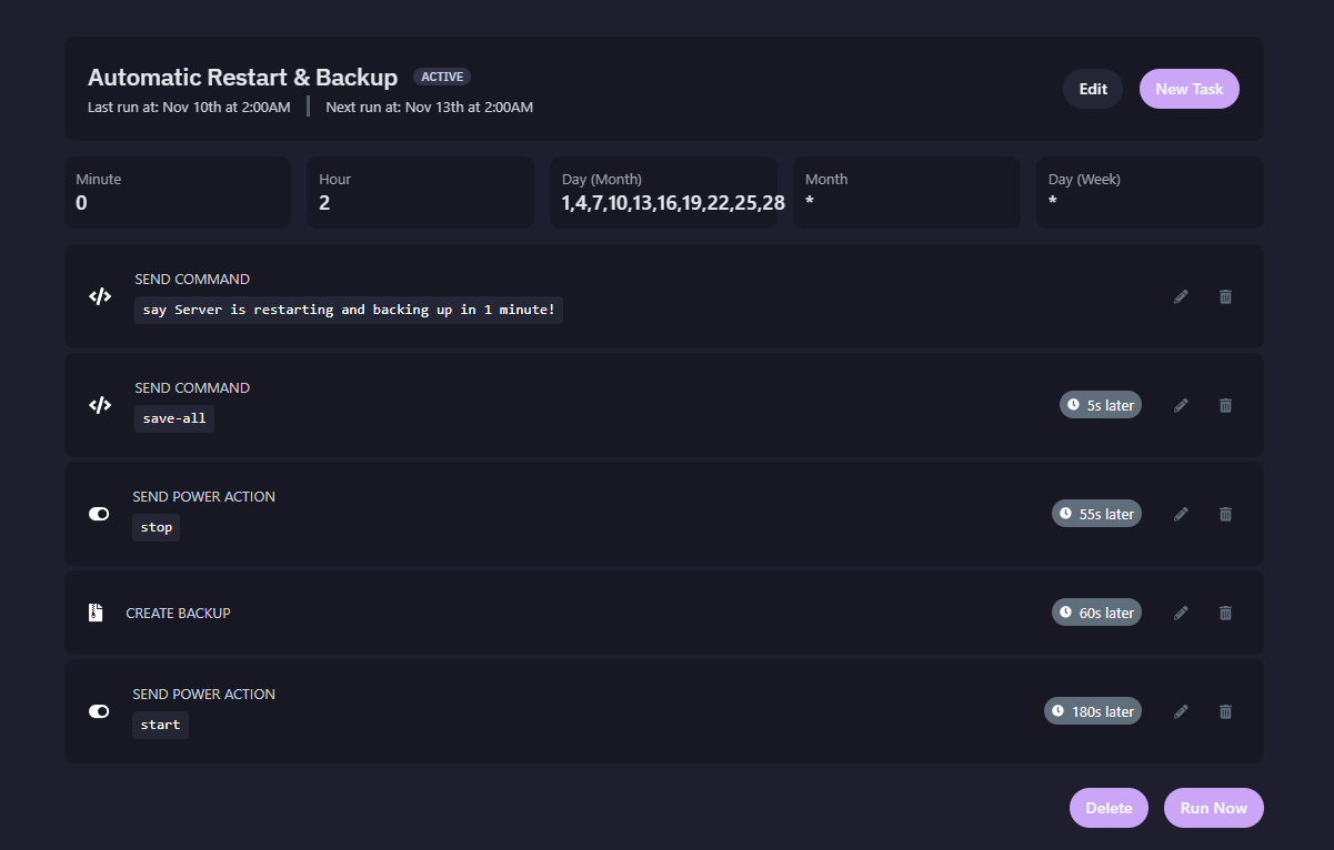 | **Nightly Restart**    | <p>1. Send message “Restarting soon!”<br>2. Restart server</p> | Every day at 3 AM   |